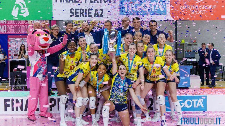 La CDA Talmassons scrive dunque ufficialmente la storia, diventando la prima squadra friulana a raggiungere la massima serie del volley femminile. Un capolavoro creato da una società che ha festeggiato proprio quest’anno i suoi 30 anni, conquistando il miglior regalo possibili per sé e per tutti i tifosi che soprattutto in questa stagione non hanno mai fatto mancare il sostegno alle Pink Panthers. Ora il sogno è ufficialmente realtà.