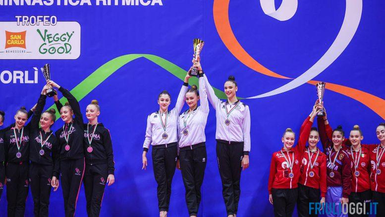 Una gara perfetta quella delle ginnaste dell’Associazione Sportiva Udinese in occasione della seconda prova della Regular Season del Campionato di massima serie. All’Unieuro Arena di Forlì Tara Dragaš al cerchio (28.767) e al nastro (28.000), Gaia Mancini alla palla (26.467) e Isabelle Tavano alle clavette (27.267), hanno chiuso con delle prove impeccabili che le hanno portate sul gradino più alto del podio, con un punteggio totale di 110.501. Bellissima gara anche per Elena Perissinotto, prestito in A2 con la società milanese, che punta alla serie A1, Moderna Legnano.