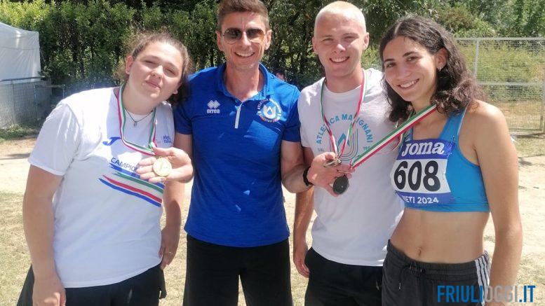 A cominciare da Giada Cabai che a Rieti ha conquistato l’oro con la misura di 14.78. Un dominio mai messo in discussione fin dal primo lancio. Per Giada (nella foto con il direttore tecnico Andrea Alterio e i compagni Nonino e Vattolo, ndr) l’ennesimo titolo nazionale, in questo caso junior, e la certezza di prendere parte ai mondiali di categoria di Lima a fine agosto.