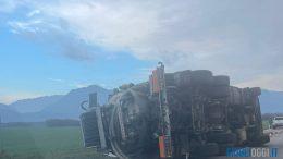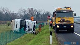 Camion senza controllo si ribalta su un fianco lungo la strada regionale
