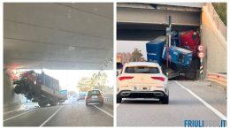 Incidente a Muzzana, camion sbatte contro il cavalcavia e resta sospeso