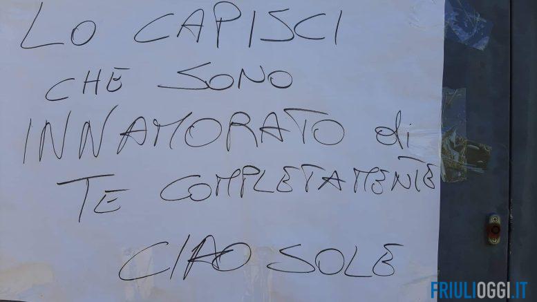 Da un paio di giorni, infatti, all’esterno della storica Villa Moretti a Tarcento, vengono affissi dei bigliettini d’amore, che il misterioso innamorato affigge sulla porticina esterna ai contatori del gas. Un messaggio chiaro, romantico, senza troppi giri di parole, che senza dubbio ha regalato un tenero sorriso soprattutto ai residenti che, transitando davanti alla villa, non hanno potuto fare a meno di notarli.