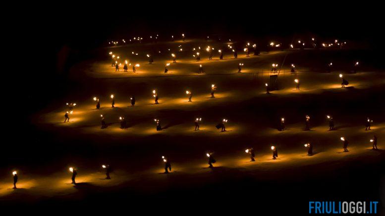 Una tradizione iniziata più di 50 anni fa, quando un gruppo di amici decise di scendere lungo la pista Di Prampero, circa 3,5 km di lunghezza, portando una fiaccola in mano. All’inizio erano in 20, oggi sono 250 i fedelissimi che ogni anno disegnano questo serpentone di fiaccole che per 45 minuti regala coreografie uniche per valligiani e turisti vicini e lontani.