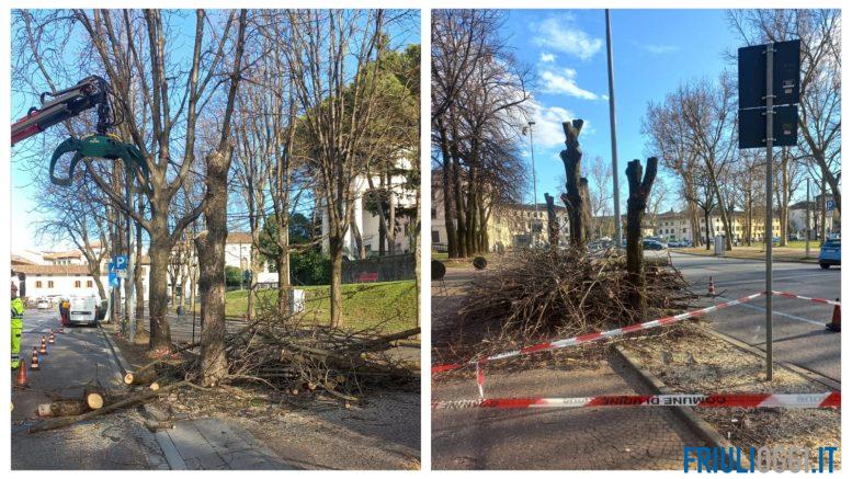 Nella mattinata di martedì 20 febbraio gli addetti comunali del Verde pubblico di Udine hanno iniziato le procedure di abbattimento del filare esterno di alberi posizionato sul lato nord-est di Piazza Primo Maggio. L’intervento proseguirà anche nella giornata di mercoledì e ad essere rimossi saranno in tutto 7 alberi.