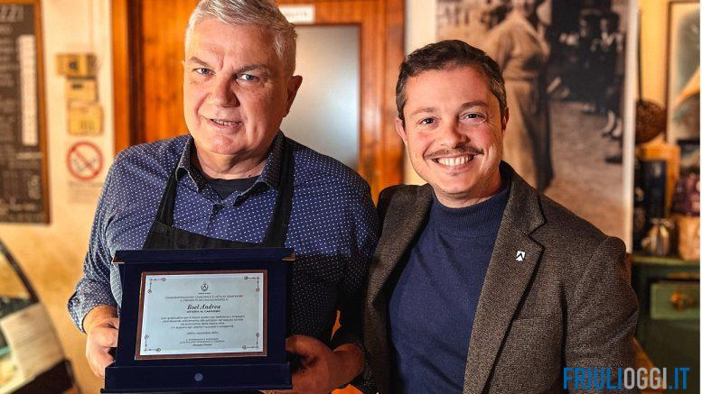Il vicesindaco e Assessore a sviluppo economico e turistico Alessandro Venanzi ha consegnato una targa commemorativa per i 40 anni di gestione dell’osteria al Canarino di Andrea Boel. “L’osteria Al Canarino è un locale storico di Udine, uno di quelli entrati indelebilmente nell’immagine e nel vissuto della nostra città”, ha detto il Vicesindaco.