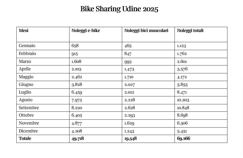 A commentare i dati è l’assessore alla mobilità Ivano Marchiol: “Il servizio si è dimostrato essere non solo un’alternativa per i turisti (come mostrano i picchi di luglio e agosto con oltre 8.000 e 10.000 noleggi), ma è diventato un pilastro della mobilità urbana per studenti e lavoratori, specialmente a settembre e ottobre. Il successo del 2025 fa pensare alla possibilità di valutare, se i Comuni contermini sono interessati, l’estensione del servizio anche al territorio dell’hinterland udinese, dato che già ora ci sono molti utenti dei comuni vicini che utilizzano le biciclette per una parte dei loro spostamenti casa-lavoro verso Udine”.