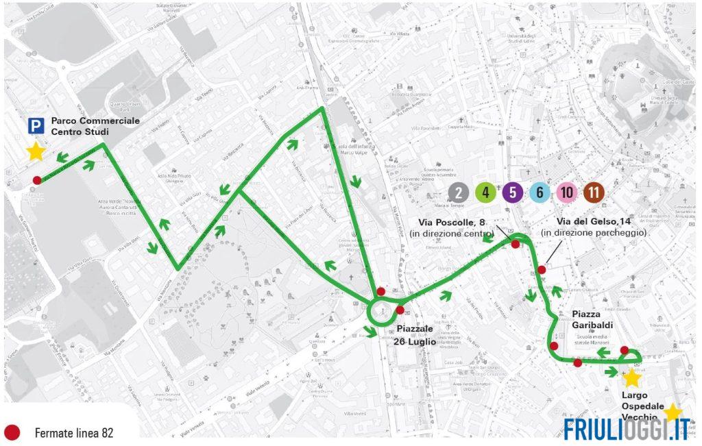 La Linea 82 collega i parcheggi gratuiti nei pressi del parco commerciale Centro Studi (via Luzzatto) a largo Ospedale Vecchio, tutti i giorni feriali nella fascia oraria dalle 8.00 alle 20.00, con corse ogni 15 minuti, sul seguente percorso: Largo Ospedale Vecchio, Piazza Garibaldi, Via del Gelso, Piazzale 26 Luglio, Via Luzzatto, Piazzale 26 Luglio, Via Poscolle, Largo Ospedale Vecchio.