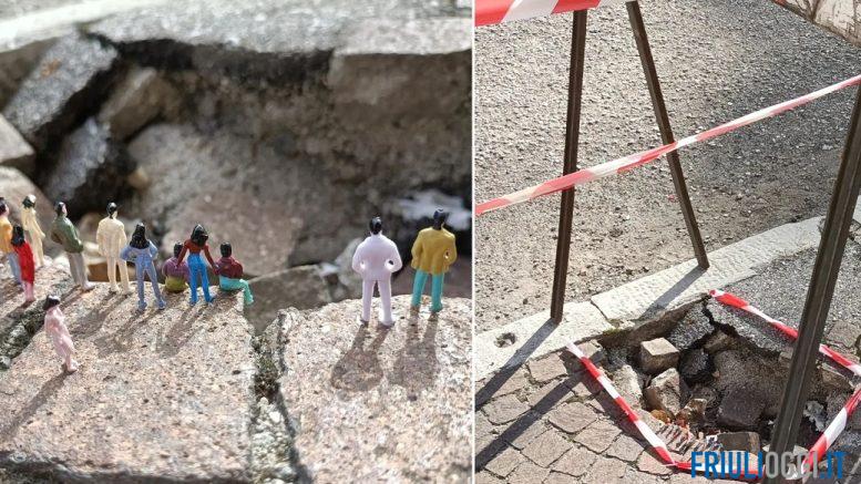 Tutto è nato perché si è aperta una voragine lungo il marciapiede della strada del capoluogo friulano che collega via Deciani e via Gemona. Così, qualcuno ha pensato di posizionare sul “baratro” le riproduzioni di alcune persone in formato mignon che osservano “l’abisso”. Un modo decisamente singolare ed estroso di segnalare il problema, che però si è rivelato estremamente efficace perché ieri, lunedì 2 ottobre, il Comune è intervenuto posizionando una transenna di sicurezza attorno al buco e poi sistemando i sanpietrini.