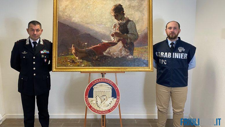 I carabinieri del Nucleo Tutela del Patrimonio Culturale di Udine hanno restituito al legittimo proprietario un dipinto (cm 107 per 136), olio su tela firmato dal pittore trentino Eugenio Prati (Caldonazzo, 1843 – 1907) dal titolo: “Studio e lavoro“ seconda edizione realizzata dall’autore nel 1895-96. Si tratta di una tela di forte impatto emozionale che raffigura una giovane ragazza seduta su di un prato fiorito con alle spalle gli scorci delle montagne trentine e che si rifà ad una prima rappresentazione dell’autore dal medesimo titolo realizzata nel 1888 ambientata però all’interno di un’abitazione. In questa opera il Prati sceglie di rappresentare una ragazza en plein air intenta a ricamare con un libro appoggiato sulle ginocchia e con lo sguardo fisso sul suo lavoro.