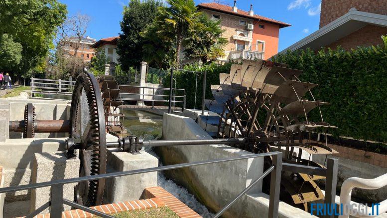 Il mulino era un punto di riferimento anche economico per il quartiere di Chiavris e si trovava in stato di cattiva conservazione. Le ruote sono state recuperate e le parti in legno sono state realizzate ex novo. Un intervento di riqualifica complicato dalla presenza dell’acqua e realizzato dall’impresa LAAR. L’intera installazione è stata dotata di una speciale illuminazione notturna.