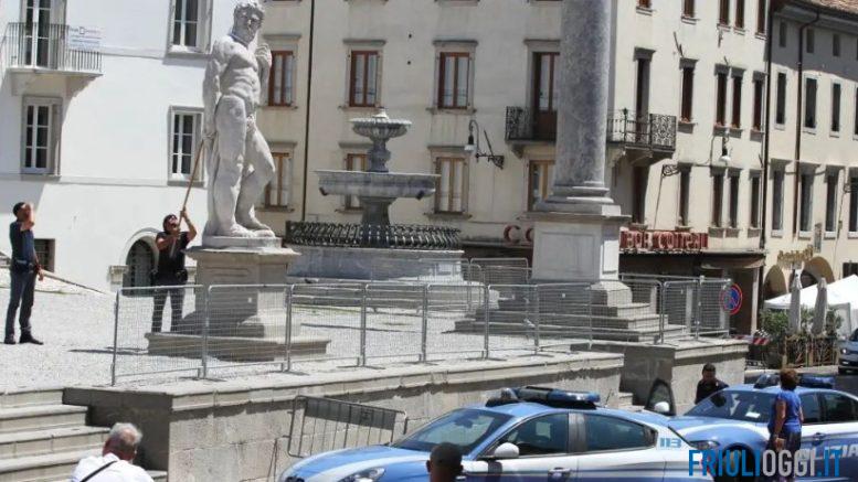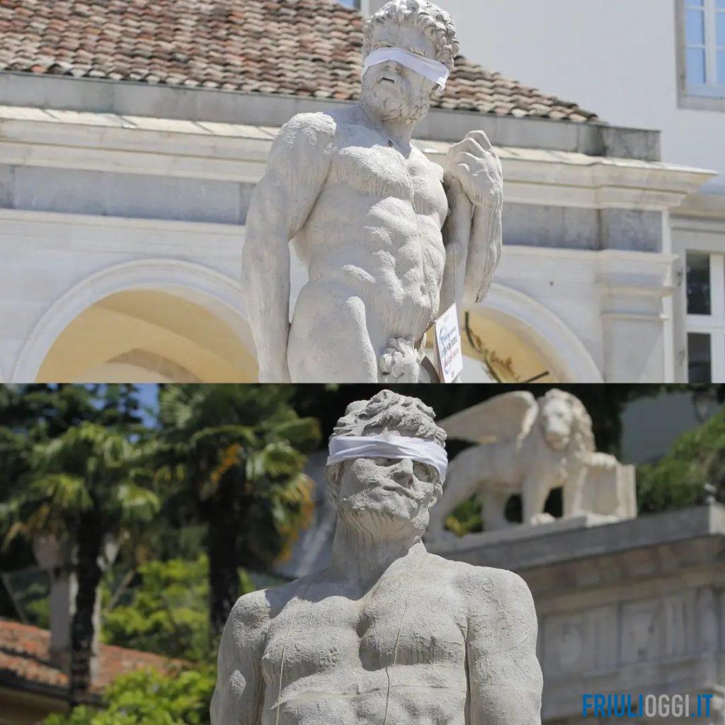 Udine, blitz degli attivisti di Extinction Rebellion: bendate le statue di piazza delle Libertà.