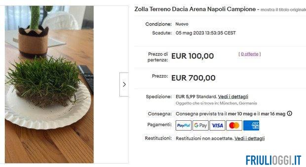 Il rettangolino di terra sradicato allo Stadio Friuli, come riporta il Gazzettino, è in vendita alla cifra non certo simbolica di ben 700 euro con un prezzo di base di 100 euro: “Zolla Terreno Dacia Arena Napoli Campione raccolta in occasione della vittoria del terzo scudetto del Napoli” è il nome del prodotto online mentre la descrizione cita “non usata e in condizioni nuove”. Evidentemente, se la zolla è originale, è stata recuperata da qualcuno che è riuscito ad accedere al campo di gioco.