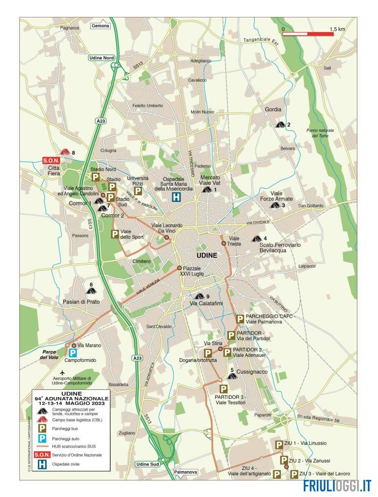 Chi arriva in occasione dell’Adunata potrà fare affidamento su alcune grandi aree di sosta come quelle dello Stadio Friuli, presso la sede dell’Università in via delle Scienze, nell’Hub 3 limitrofo a viale Monsignor Nogara, nella sede Cafc di viale Palmanova e nel grande spazio di fronte al campo volo lungo la Statale 13 tra Pasian di Prato e Campoformido (10mila posti disponibili).