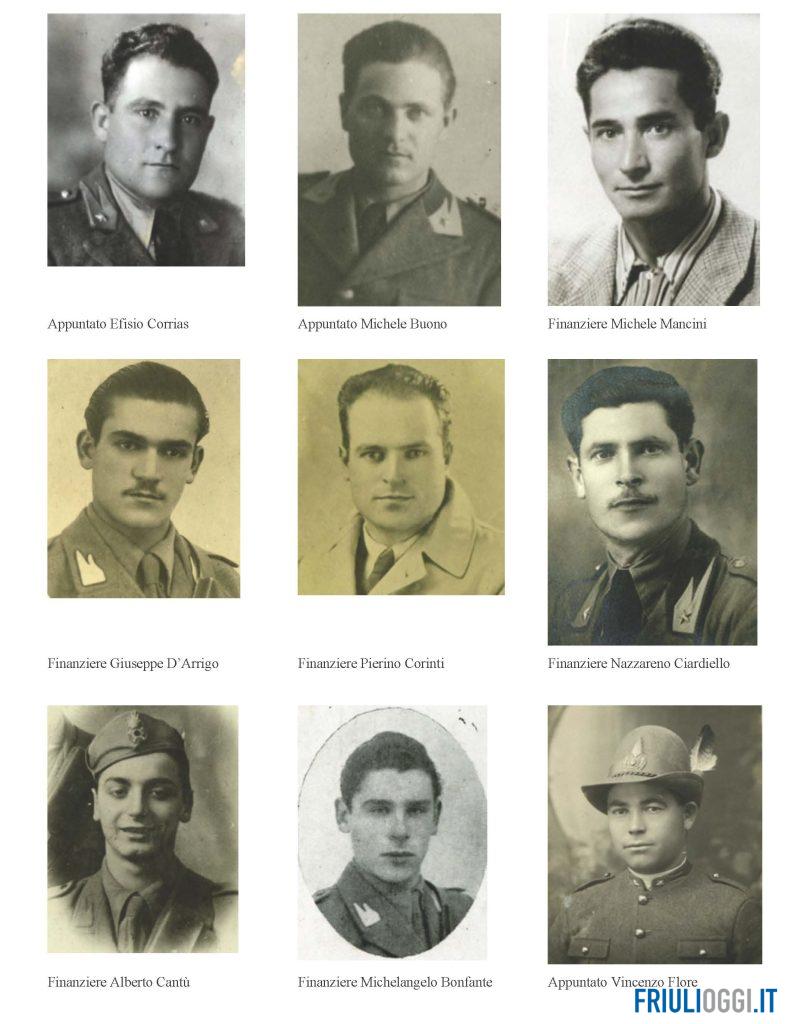 All’epoca, gli Appuntati Vincenzo Flore, nativo di Busachi (OR) e Michele Buono, da Maddaloni (CE), i Finanzieri Alberto Cantù e Giuseppe D’Arrigo, da Genova, Michelangelo Bonfante, originario di Sanremo (IM), Nazzareno Ciardiello, originario di Benevento, Pierino Corinti, di Castiglione in Teverina (VT) e Michele Mancini, nativo di Peschici (FG), tutti appartenenti alla Compagnia Autonoma della R. Guardia di Finanza di Udine, prestavano servizio presso il piccolo Distaccamento di via Buttrio, alla periferia del capoluogo friulano. Li comandava l’appuntato Efisio Corrias, un militare nativo di Decimomannu (CA).