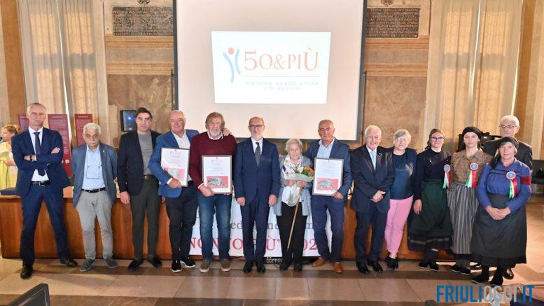 Lo sguardo del nonno che cerca il nipote tra le braccia dei genitori e gli dedica il premio “Nonno Più”. Nel Salone del Parlamento del Castello di Udine, la tredicesima Festa dei nonni e l’ottava edizione del concorso diventano occasione di ricordi, emozioni, commozione. I premiati dell’iniziativa promossa dalla 50&Più di Udine, l’associazione degli over 50 aderente a Confcommercio, sono stati quest’anno l’ex cestista Lorenzo Bettarini, l’ex saltatore con gli sci Leonardo De Crignis, oggi maestro di vita per i ragazzi nella sua Ravascletto, e Stefano Toppano, fondatore di Oro Caffè. A diventare protagonisti della giornata i nipoti di Bettarini, Raffaele, di De Crignis, Mattia, Egle e Cloe, e di Toppano, Pietro, citati ripetutamente al momento della consegna delle targhe.