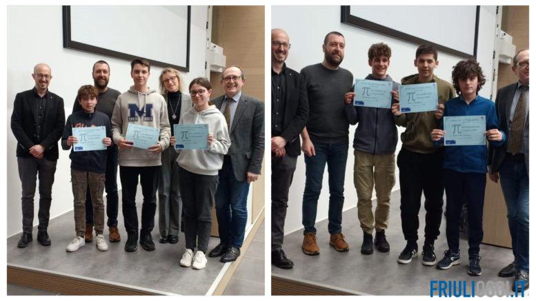 Per il primo biennio delle scuole superiori i primi tre classificati sono stati: Alberto Sciaudone (Liceo Marinelli di Udine, 121 cifre), Gabriel Milocco (Isis “Malignani” di Udine, 100 cifre), Sara Piccini (Liceo Marinelli, 80 cifre).