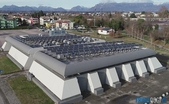 I quattro impianti di produzione di energia elettrica tramite conversione fotovoltaica si trovano, uno sul tetto del polo economico giuridico di via Tomadini e tre nell’area del polo scientifico dei Rizzi: in via delle Scienze sulle coperture del complesso didattico e della centrale tecnologica, in via Sondrio sul tetto dell’edificio ex Basket adibito ai laboratori didattici.
