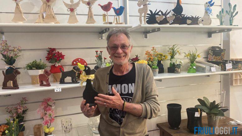 Era il 2001 e dovevamo ancora familiarizzare con la nuova moneta e il richiamo al basso prezzo profumava d’affare. Il negozio ha troneggiato per un bel po’ di anni con le sue tre vetrine a metà della via cittadina. Poi, Franca è venuta a mancare e Franco ha ridotto lo spazio, dando sfogo ad un’altra sua passione: quella di artigiano e intagliatore del legno. Rigorosamente riciclato, peró. Così da tre anni a questa parte, pallet e vecchie assi diventano simpatici coniglietti, dolci angioletti o pratici taglieri per la casa.Franco li realizza a mano e li espone ordinatamente sui ripiani del negozio o li mette in mostra sui social.