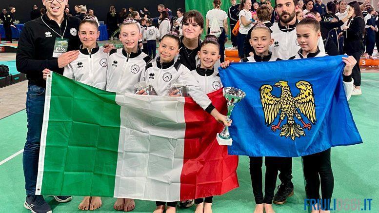 Dopo una qualifica molto buona, Agata Moreale, Giulia Giacomini, Agnese Lanzara, Elena Sattolo, Ludovica Vit e Ludovica Oleotto hanno affrontato una finale complessa, dove si sono confrontate con le dieci migliori squadre allieve gold 3B d’Italia, dimostrandosi al livello. Anche se la gara non era iniziata nel migliore dei modi, con degli errori nelle parallele, il primo attrezzo, le ragazze sono riuscite ad affrontare tutti gli altri attrezzi con sempre maggiore precisione, facendo i migliori esercizi a corpo libero di tutta la gara, e ovviamente, sono riuscite a finire la competizione con questo magnifico successo.