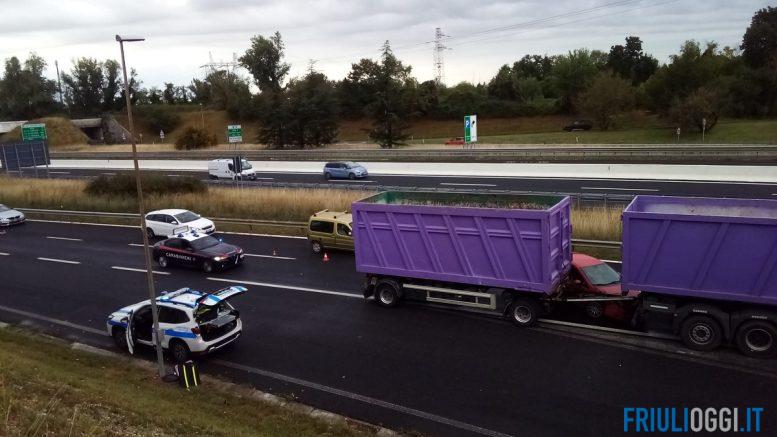 Rocambolesco incidente, per fortuna senza conseguenze serie per le persone coinvolte, questa mattina, intorno alle 7.30, lungo la tangenziale di Udine.