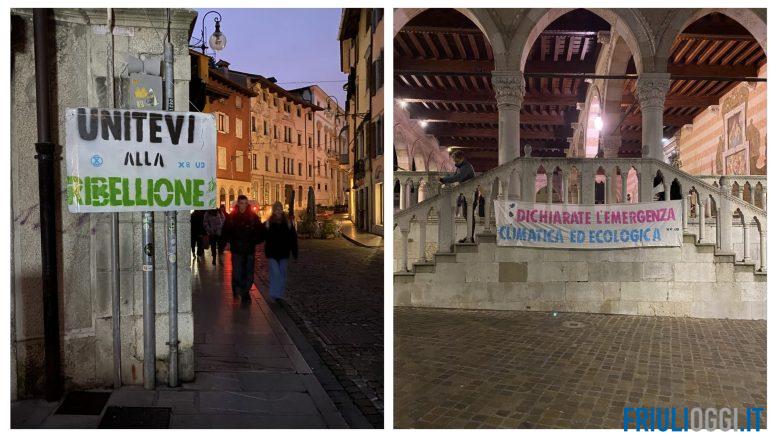 “La crisi climatica non va in vacanza”, “+1,5°C = collasso sociale” (aumento massimo della temperatura globale stabilito negli accordi di Parigi), e “no sarà pui une Ledre dulà la butasi” (un’allusione ironica alle conseguenze della siccità). La città di Udine, alla vigilia della pausa per le feste, si è svegliata tappezzata di striscioni e manifesti recanti questi e altri slogan nella mattina di venerdì 23 dicembre. Opera degli attivisti di Extinction Rebellion, un movimento internazionale non-violento che usa la disobbedienza civile e l’arte per spingere a un’azione incisiva da parte dei governi sull’emergenza climatica. Nel corso della mattinata, gli attivisti stessi hanno provveduto a smantellare gli allestimenti da loro realizzati e a dialogare con le persone.
