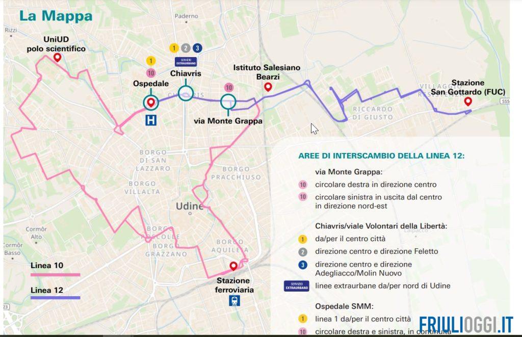 Ha inaugurato oggi il nuovo e atteso servizio urbano con i bus che collegheranno la stazione di San Gottardo (FUC Udine Cividale) e l’ospedale Santa Maria della Misericordia. La nuova Linea 12, che servirà tutta l’area est della città ed è il frutto del lavoro congiunto di Regione FVG e Comune di Udine, è attiva dal lunedì al sabato con corse ogni 30 minuti (prima corsa in partenza dal nuovo capolinea interno alla stazione di San Gottardo alle ore 7.22 con arrivo in ospedale alle ore 7.37, ultima corsa in arrivo a San Gottardo alle ore 20.35).