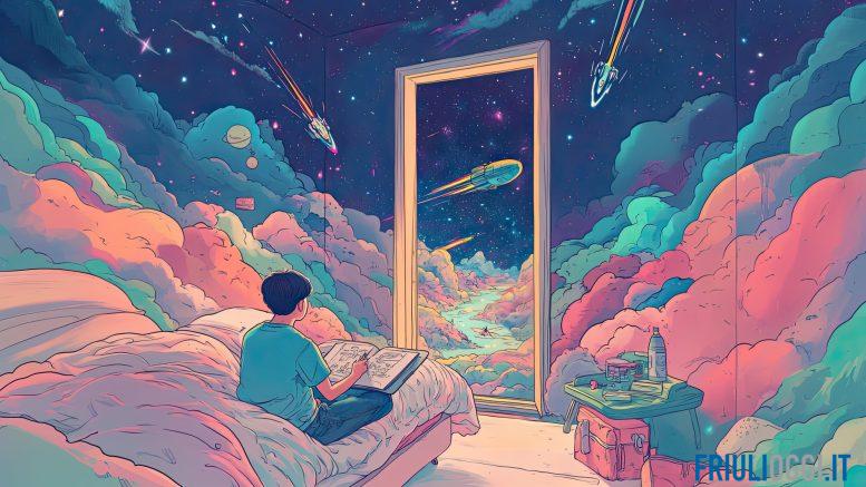 L’illustrazione della campagna 2025 è firmata quest’anno da Cristiano Antonutti. Una libera interpretazione dell’aggettivo “visionario”: seduto sul letto, nella sua stanzetta, troviamo infatti un ragazzino che lascia completamente libera la fantasia e comincia a volare. Comincia a esplorare tutti i mondi possibili, proprio come succede al cinema appena si spengono le luci. Antonutti, architetto e appassionato di arti applicate (dalla musica al disegno a mano fino alle Generative AI), lavora come collaboratore presso studi di progettazione ed aziende della provincia di Udine.