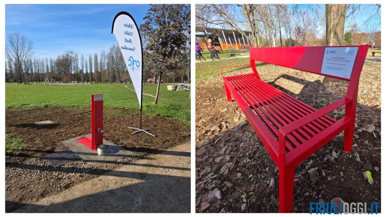 Una panchina e una fontanella, entrambe rosse, a ricordare le vittime di femminicidio e rappresentare un gesto di cura verso la comunità, sono le opere inaugurate nella mattinata di sabato 29 novembre al Parco del Cormor di Udine, presso l’area giochi.