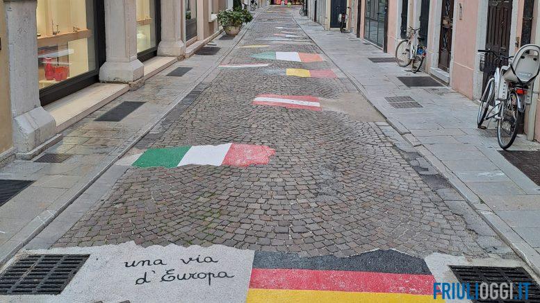 La piccola e suggestiva via Cortazzis a Udine, lunga poche decine di metri, è diventata in poche settimane una “passeggiata” d’Europa in cui trovano spazio i vessilli dei 27 Paesi ai quali si aggiunge quello della città di Udine.