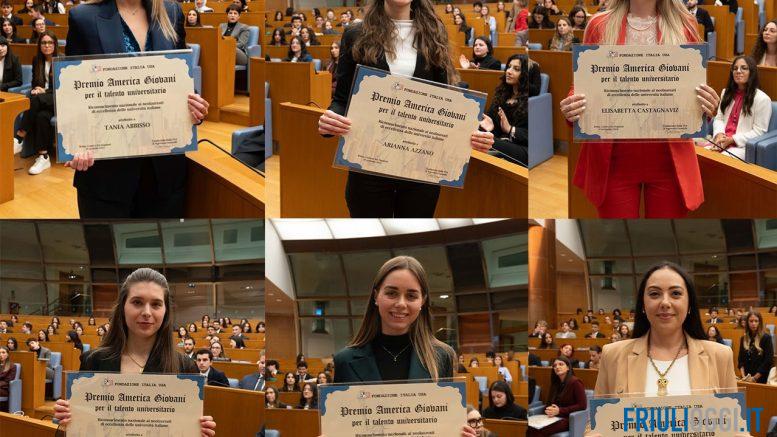 La Fondazione Italia Usa ha assegnato a sei laureate dell’Università di Udine il Premio America Giovani al talento universitario. Il riconoscimento è destinato a neolaureate e neolaureati con percorsi di studi di eccellenza per sostenerli nell’ingresso nel mondo del lavoro internazionale. Le vincitrici sono Tania Abbisso, Arianna Azzano, Elisabetta Castagnaviz, Margherita Nigris, Beatrice Polano, Maria Chiara Tripodo. La cerimonia di premiazione si è svolta alla Camera dei deputati a Roma. Il premio è una borsa di studio per partecipare gratuitamente al master in “Leadership per le relazioni internazionali e il made in Italy” organizzato dalla Fondazione che ogni anno premia mille laureati “eccellenti”.