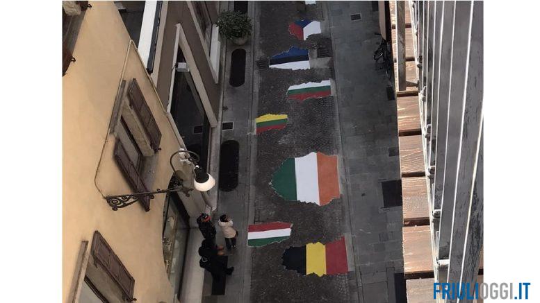 In attesa del cantiere di rifacimento della pavimentazione, quindi, l’idea è stata di dipingere, su quei rattoppi, le bandiere dei Paesi dell’Unione Europea e lo stemma del Comune di Udine, regalando alla via un volto nuovo e colorato e trasformando una criticità in un’opera d’arte.