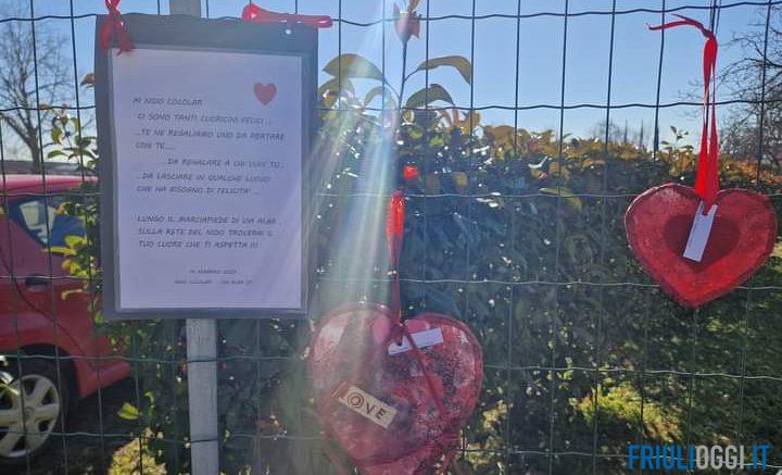 Una bellissima iniziativa per San Valentino quella di questa mattina fuori dall’asilo nido Cocolar nel quartiere di Paderno di Udine, dove alcuni cuori sono spuntati sulla recinzione.