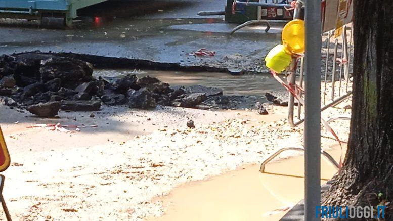 Perdita d’acqua in via Leonardo da Vinci a Udine.