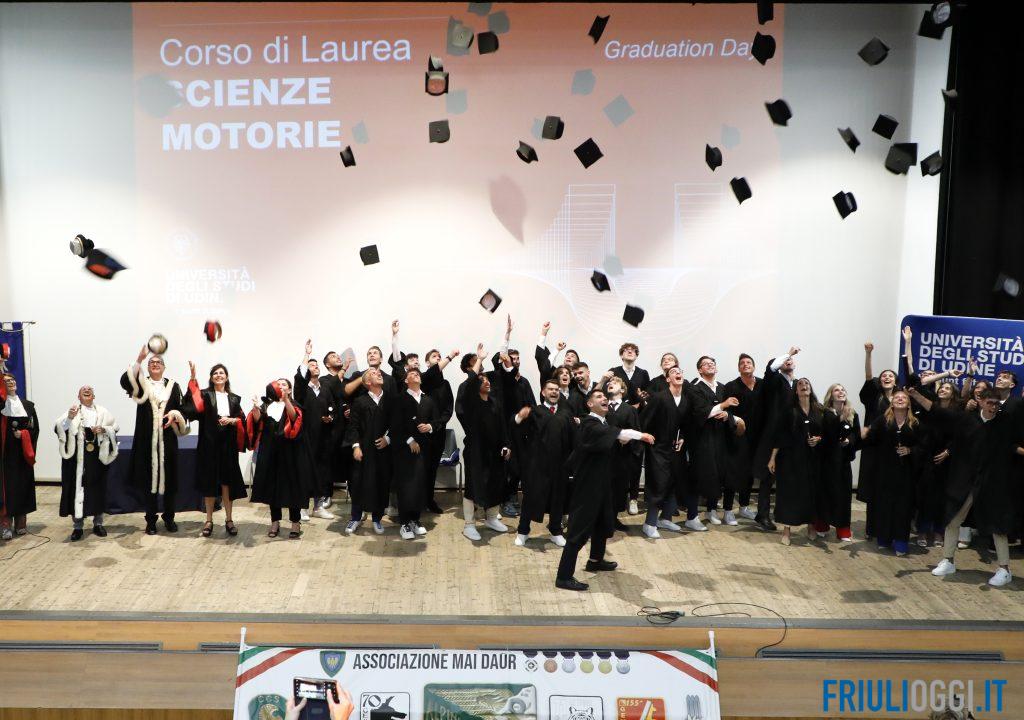 “Da quando è nato, il Corso di laurea in Scienze motorie dell’Ateneo, con sede a Gemona del Friuli e ad accesso programmato – spiega la coordinatrice Maria Parpinel – ha visto progressivamente aumentare il numero degli iscritti fino alle attuali 160 matricole previste per l’anno accademico 2023/2024. Questo per venire incontro alle esigenze di professionalità nel campo della gestione delle attività motorie e sportive provenienti dal mondo della scuola e dal mondo dello sport, fino a toccare i programmi di prevenzione primaria e di promozione della salute attivi da molti anni in regione”. I festeggiamenti si sono conclusi con il tradizionale e coreografico lancio del tocco da parte dei neodottori e docenti presenti.