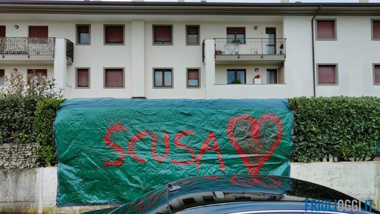 Ha destato molta curiosità la grande scritta fatta con della vernice rossa apparsa questa mattina davanti ad alcune case di Udine.
