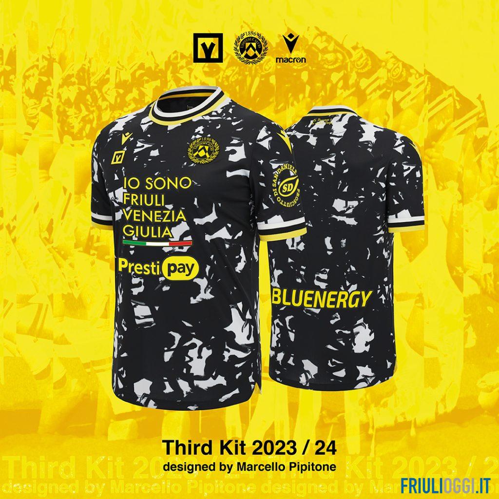 La nuova ‘Third’ dell’Udinese, che verrà indossata in campo domenica contro la Fiorentina, è a girocollo bordato da tre righe, bianca, nera e gialla. Lo stesso abbinamento cromatico è presente anche sui bordi delle maniche. Sia frontalmente che sulla schiena, è caratterizzata da un pattern bianco e nero disegnato da Marcello Pipitone e ispirato dal movimento, dall’energia della squadra e delle persone.