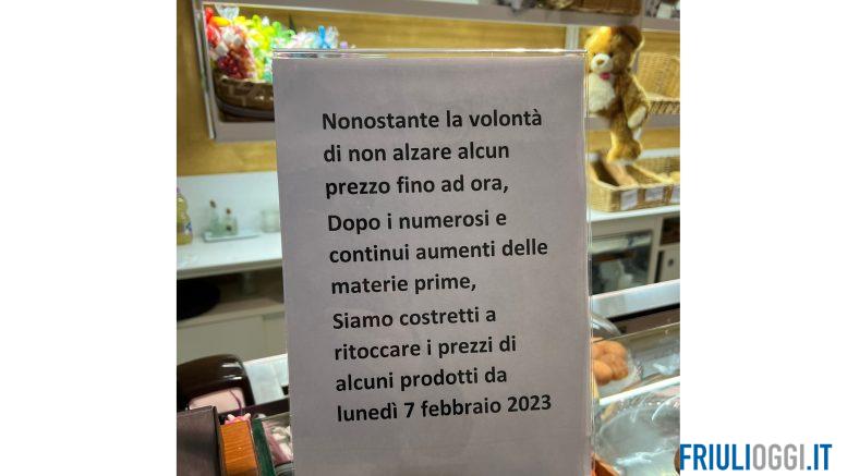 “Nonostante la volontà di non alzare alcun prezzo finora – si legge sul cartello appeso sulla vetrina -, dopo i numerosi e continui aumenti delle materie prime, siamo costretti a ritoccare i prezzi di alcuni prodotti da lunedì 7 febbraio”.