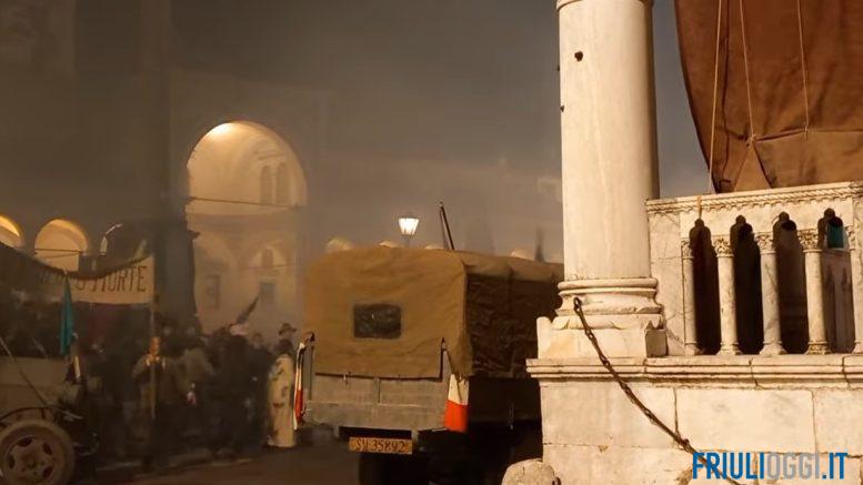 A chi è capitato di passare in centro ieri sera, non saranno sfuggire alcune bizzarrie: nebbia in Piazza Libertà, camioncini retrò in piena area pedonale, persone vestite come un secolo fa con bandiere in mano; Udine sta vivendo “un viaggio nel tempo” grazie alle riprese del film “Alla festa della rivoluzione”, ambientato nel 1919.