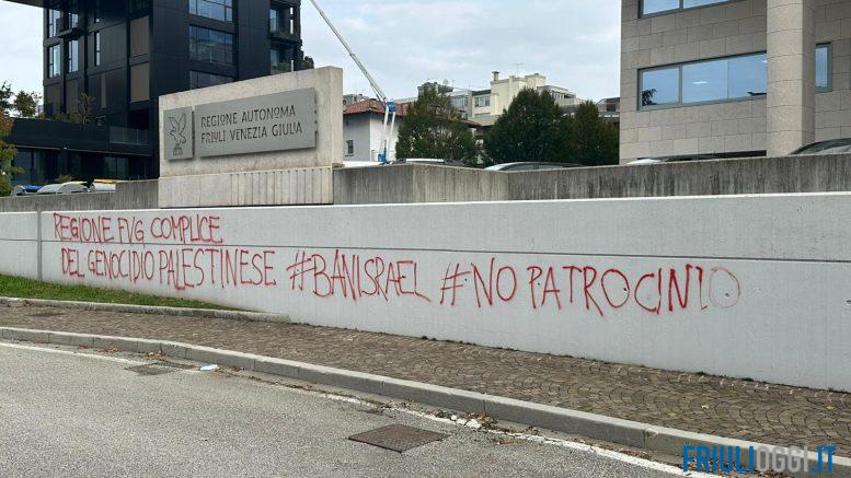 Una blindatissima Udine si prepara alla partita di questa sera, stadio Friuli ore 20.45, tra Italia e Israele. Per aumentare la tensione già palpabile in città, nella notte sono comparse diverse scritte realizzate con bombolette spray nere e rosse nella aree antistanti il Comune di Udine e la sede della Regione Friuli Venezia Giulia in via Sabbadini.