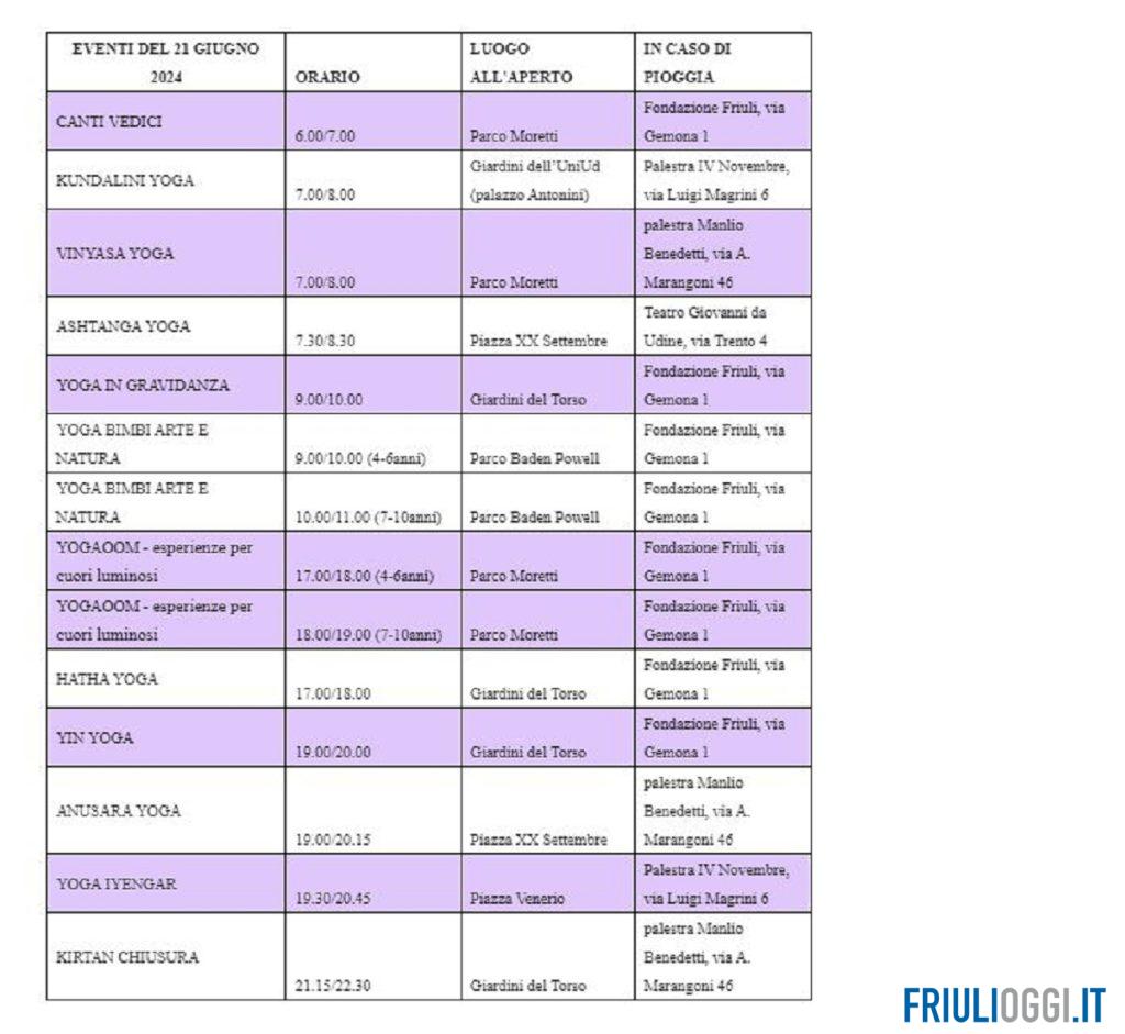 Quattordici eventi gratuiti nei giardini e nelle piazze della città; una conferenza a ingresso libero organizzata in collaborazione con l’Università degli Studi di Udine e due workshop: sono questi i numeri della settima edizione dello Yoga Day Udine (che quest’anno si presenta anche con un nuovo logo: YOU24), organizzato anche quest’anno dall’associazione Flor de Vida di Udine grazie alla concessione del Marchio Io sono Fvg, al patrocinio di Comune di Udine, Università degli Studi di Udine, Fondazione Friuli, Csen Fvg; la sponsorizzazione tecnica di Naturasì Udine, Goccia di Carnia, Sportler; grazie ai partner di Flor de Vida: Radiologia Cervignanese, Sacer-Uliana, Assifriuli Group, Etika, Banca di Udine, Teatro Nuovo Giovanni da Udine.