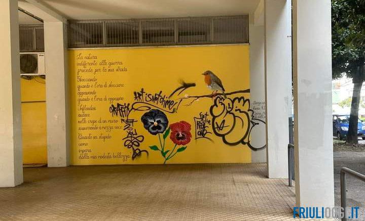 Il murale contro la guerra, realizzato dall’artista Simone Mestroni, sulla parete della sede del Circolo operaio in piazza Carnia, nel villaggio del Sole, è stato vandalizzato con scritte nere appena ventiquattro ore dopo la sua creazione.